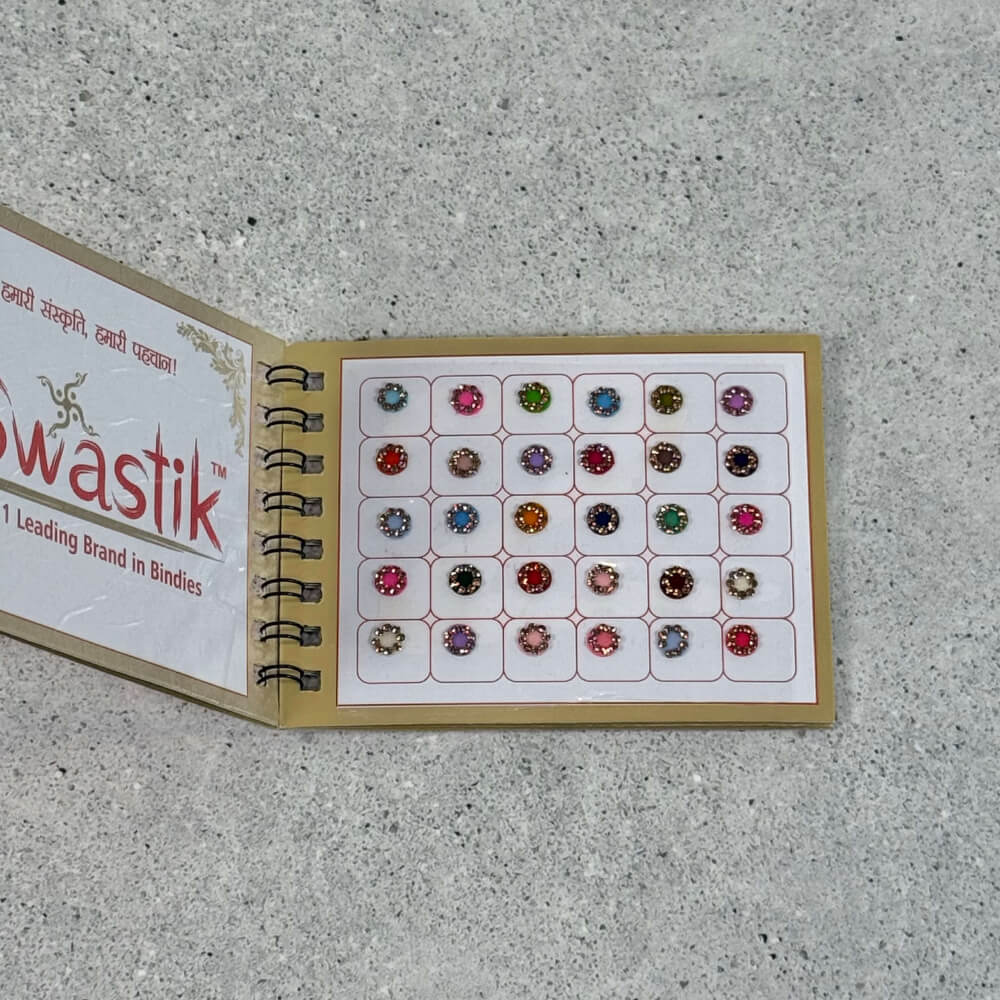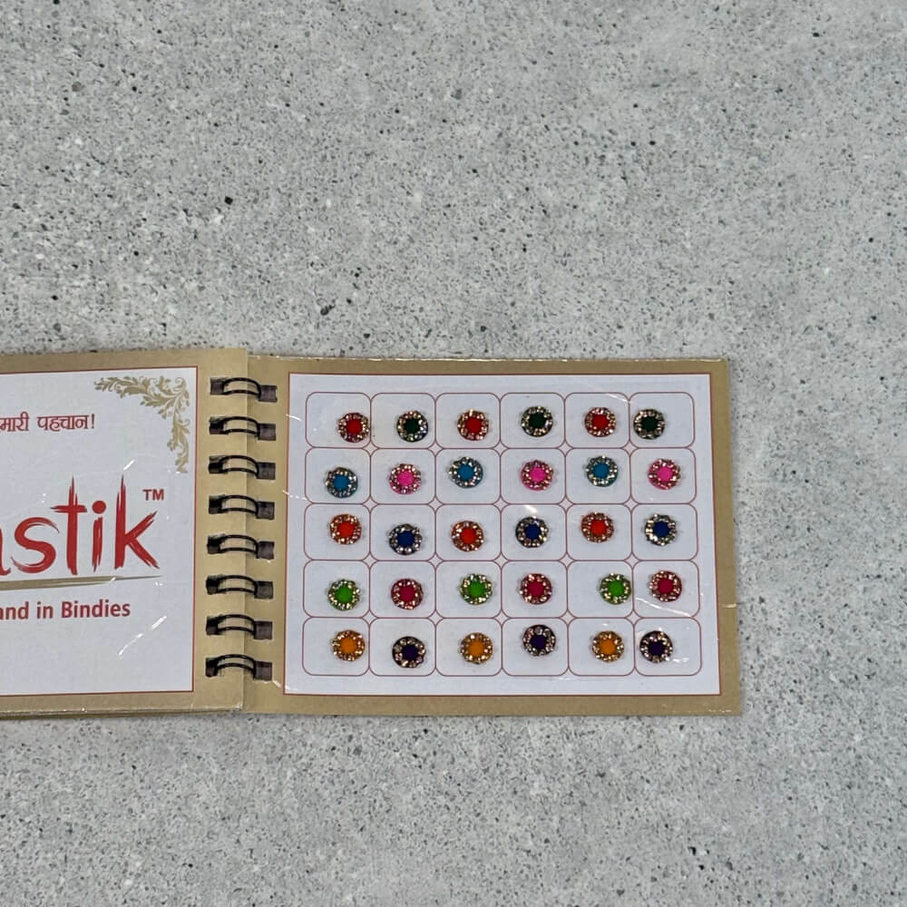 4 page bindi book – 1 page of red stickers, 1 page of maroon stickers & 2 pages of multi-colour stickers; all with gold stone border.