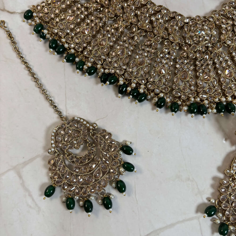 A beautifully intricate polki emerald green set designed to make head turns.