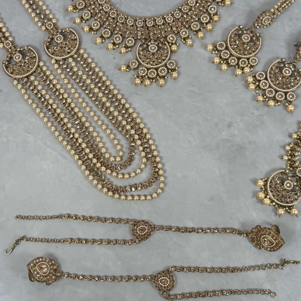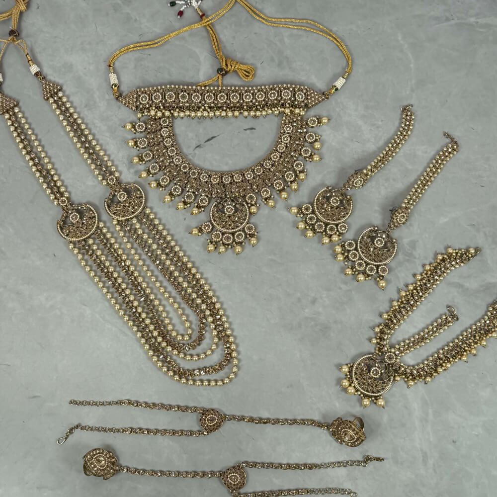 This set includes 3 necklaces (choker, short necklace & long necklace), earrings, nethichutti/maang tika and hand harnesses (pair).